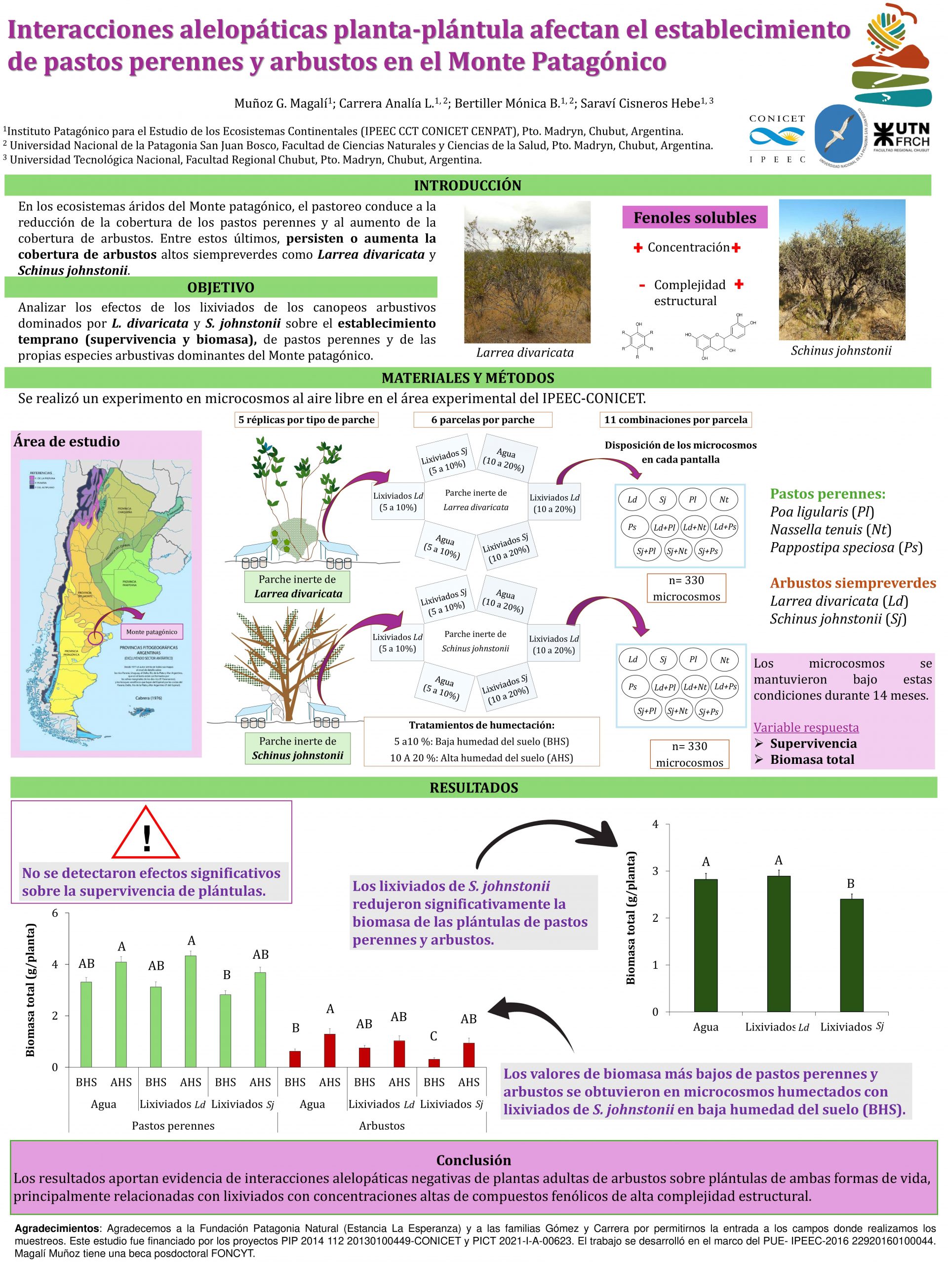 La Dra. Magalí Muñóz, becaria postdoctoral, participó con la presentación de un póster con el título: "Interacciones alelopáticas planta-plántula afectan el establecimiento de pastos perennes y arbustos en el Monte Patagónico".