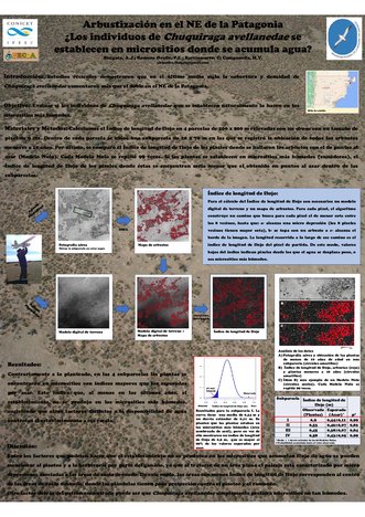 El otro que tiene como primer autor a Alejandro Bisigato fue: “Arbustización en el NE de la Patagonia ¿Los individuos de Chuquiraga avellanedae se establecen en micrositios donde se acumula agua?” El objetivo fue saber si, a escala de micrositio, el establecimiento se produce donde se acumula agua. Encontramos que el establecimiento no se produjo en los micrositios más húmedos, sugiriendo que otros factores distintos a la disponibilidad de agua controlan el establecimiento a esa escala.