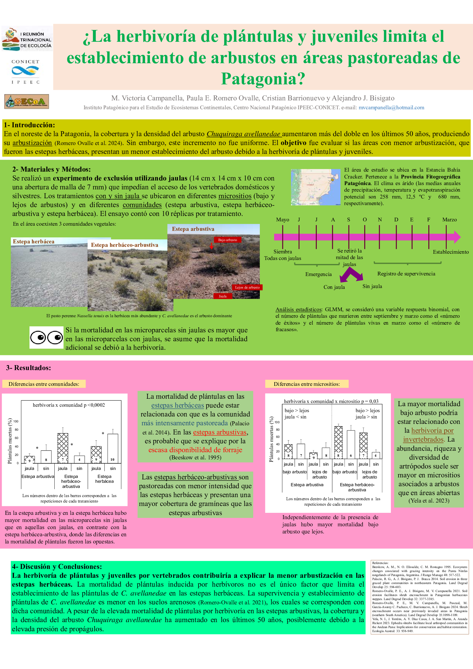 Uno fue: “¿La herbivoría de plántulas y juveniles limita el establecimiento de arbustos en áreas pastoreadas de Patagonia?” Cuyo objetivo fue evaluar si las áreas con menor arbustización, que fueron las estepas herbáceas, presentan un menor establecimiento del arbusto Chuquiraga avellanedae debido a la herbivoría de plántulas y juveniles. y encontramos que si, que la herbivoría de plántulas y juveniles por vertebrados contribuiría a explicar la menor arbustización en esa comunidad.