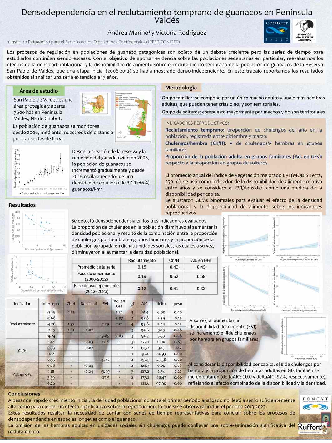 Por su parte las Dras. Victoria Rodríguez y Andrea Marino presentaron dos posters. El primero titulado "Densodependencia en el reclutamiento temprano de guanacos en Península Valdés". “En este trabajo mostramos que al extender la serie de tiempo con 10 años adicionales, el reclutamiento de los guanacos de la reserva San Pablo de Valdés, que en años previos se había mostrado independiente de la densidad, mostró una marcada densodependencia. Con este trabajo resaltamos la importancia de contar con series de tiempo representativas para concluir sobre la dinámica poblacional de especies longevas como el guanaco”.