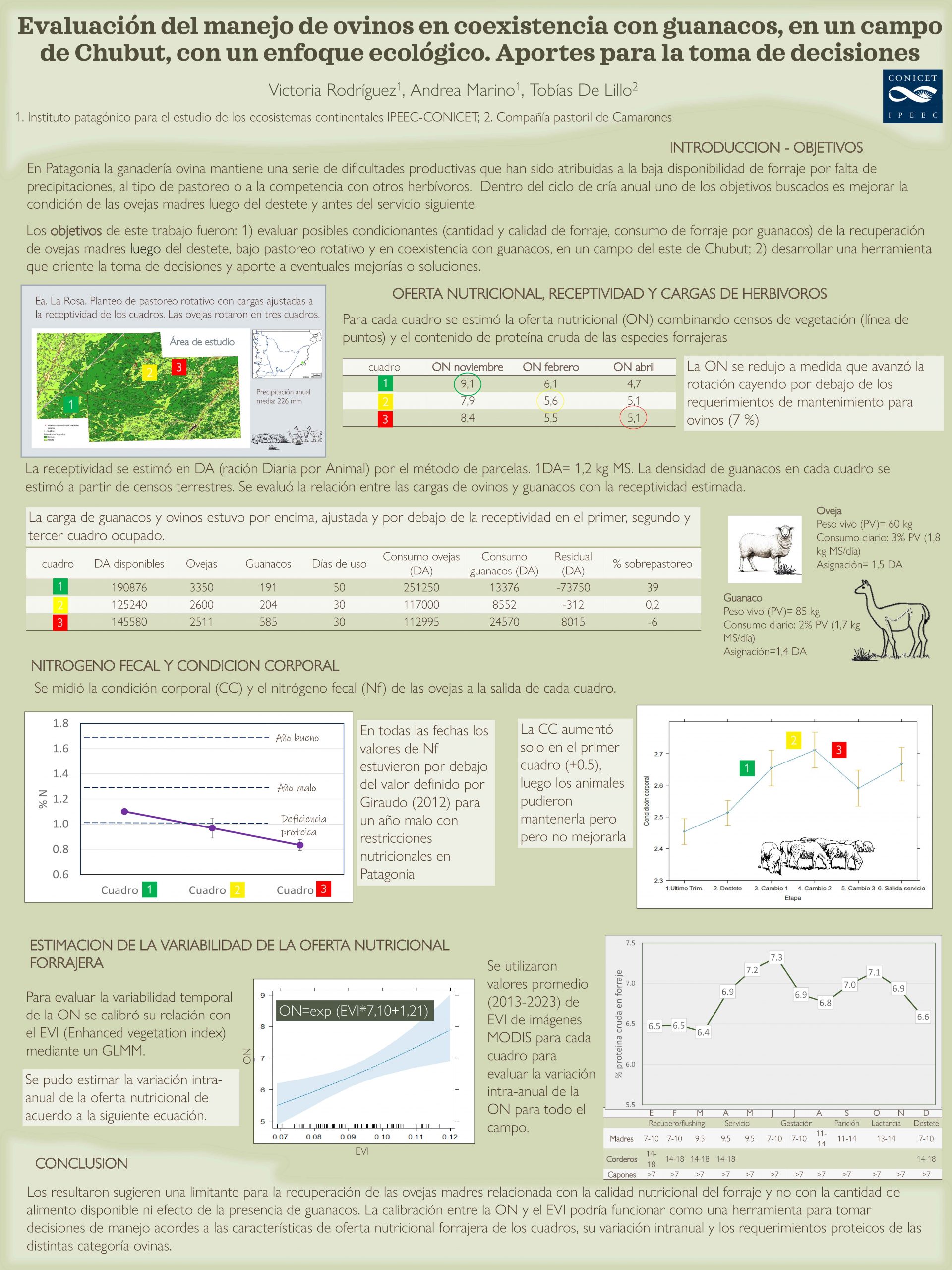 “En este trabajo buscamos evaluar posibles condicionantes de la recuperación de ovejas madres luego del destete, bajo pastoreo rotativo y en coexistencia con guanacos, en un campo del este de Chubut. También se presentó un modelo que, en base a datos de sensores remotos, resultaría útil para determinar la oferta nutricional del forraje en el campo y su variabilidad temporal y espacial”.
