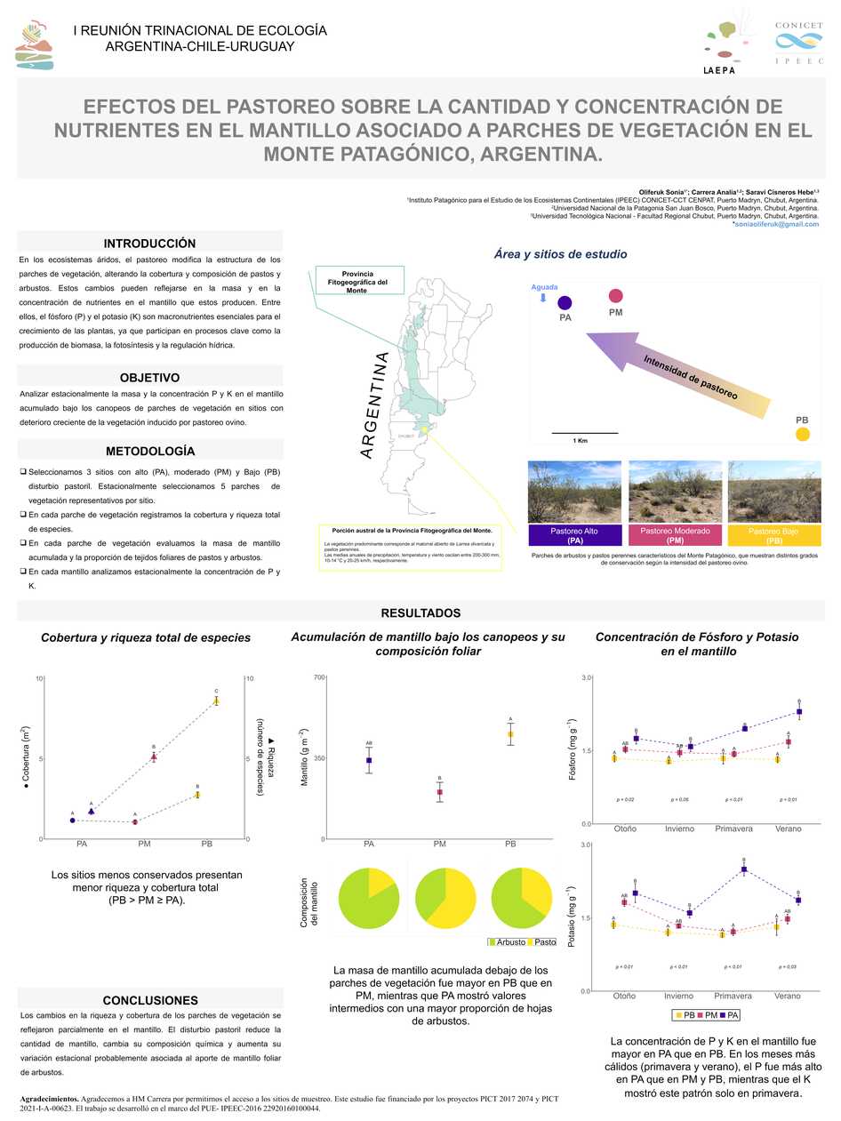 Finalmente, la Dra. Sonia Oliferuk presentó también un poster, realizado en coautoría con Analía Carrera (IPEEC-CONICET) y Hebe Saraví Cisneros (IPEEC-CONICET), cuyo título fue: “Efectos del pastoreo sobre la cantidad y concentración de nutrientes en el mantillo asociado a parches de vegetación en el Monte Patagónico, Argentina”.